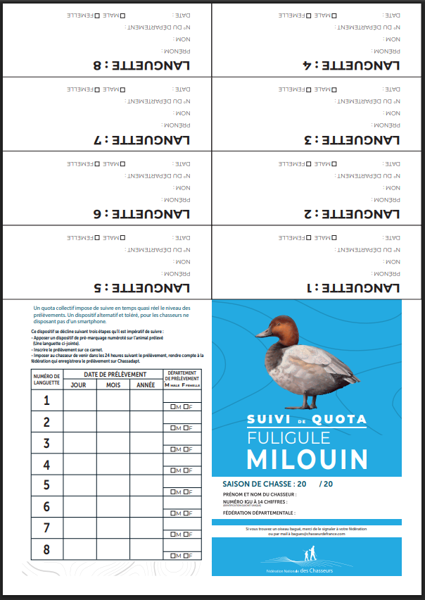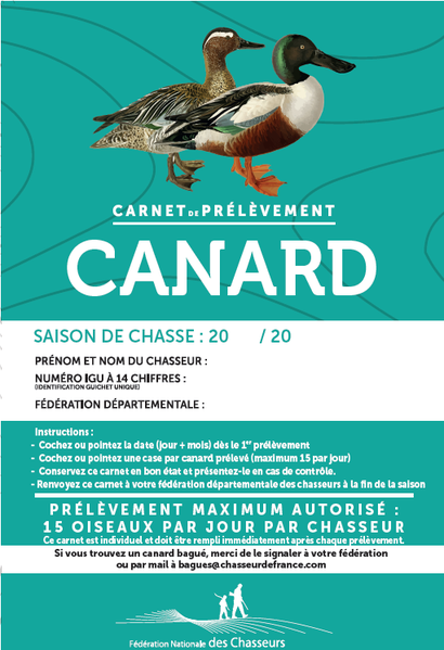 Concernant le PMA individuel de 15 oiseaux par jour et par chasseur, il y a obligation de le déclarer sur Chassadapt et cette déclaration doit être la règle. Néanmoins, conformément à l’article R 425-20-3, la FNC vous propose un modèle de carnet permettant aux chasseurs qui ne disposent pas de l’application Chassadapt de déclarer leur prélèvement de sauvagines. Cela doit être l’exception.